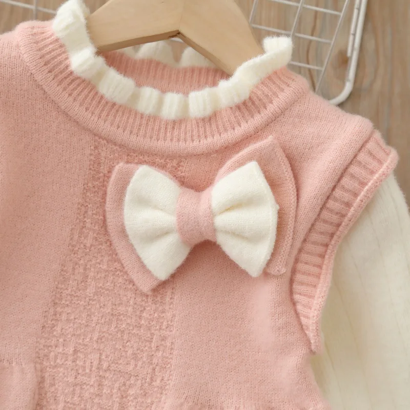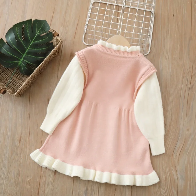 Girls' O-Neck Cartoon Sweet Lace Eco-friendly Velvet Sweater Long Skirt Winter Dress